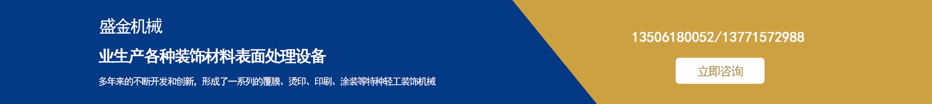 盛金機(jī)械專(zhuān)業(yè)生產(chǎn)各種裝飾材料表面處理設(shè)備 集多年來(lái)的不斷開(kāi)發(fā)和創(chuàng)新,形成了一系列的覆膜、燙印、印刷、涂裝等特種輕工裝飾機(jī)械。并敢于和善于開(kāi)發(fā)用戶(hù)急需的特殊要求機(jī)械設(shè)備。